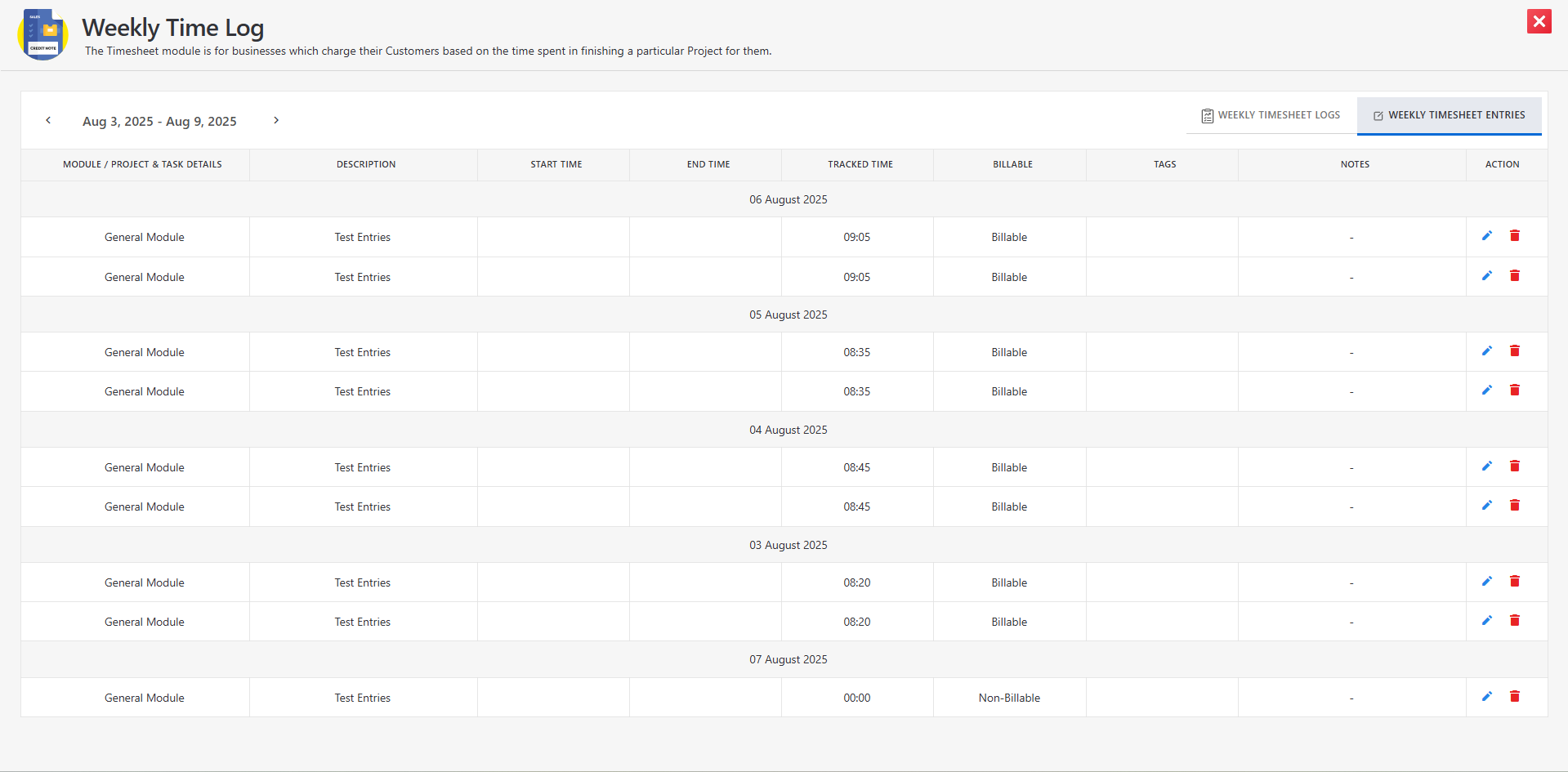 Click the Weekly Timesheet Entries tab to display all time log entries recorded for the selected week.