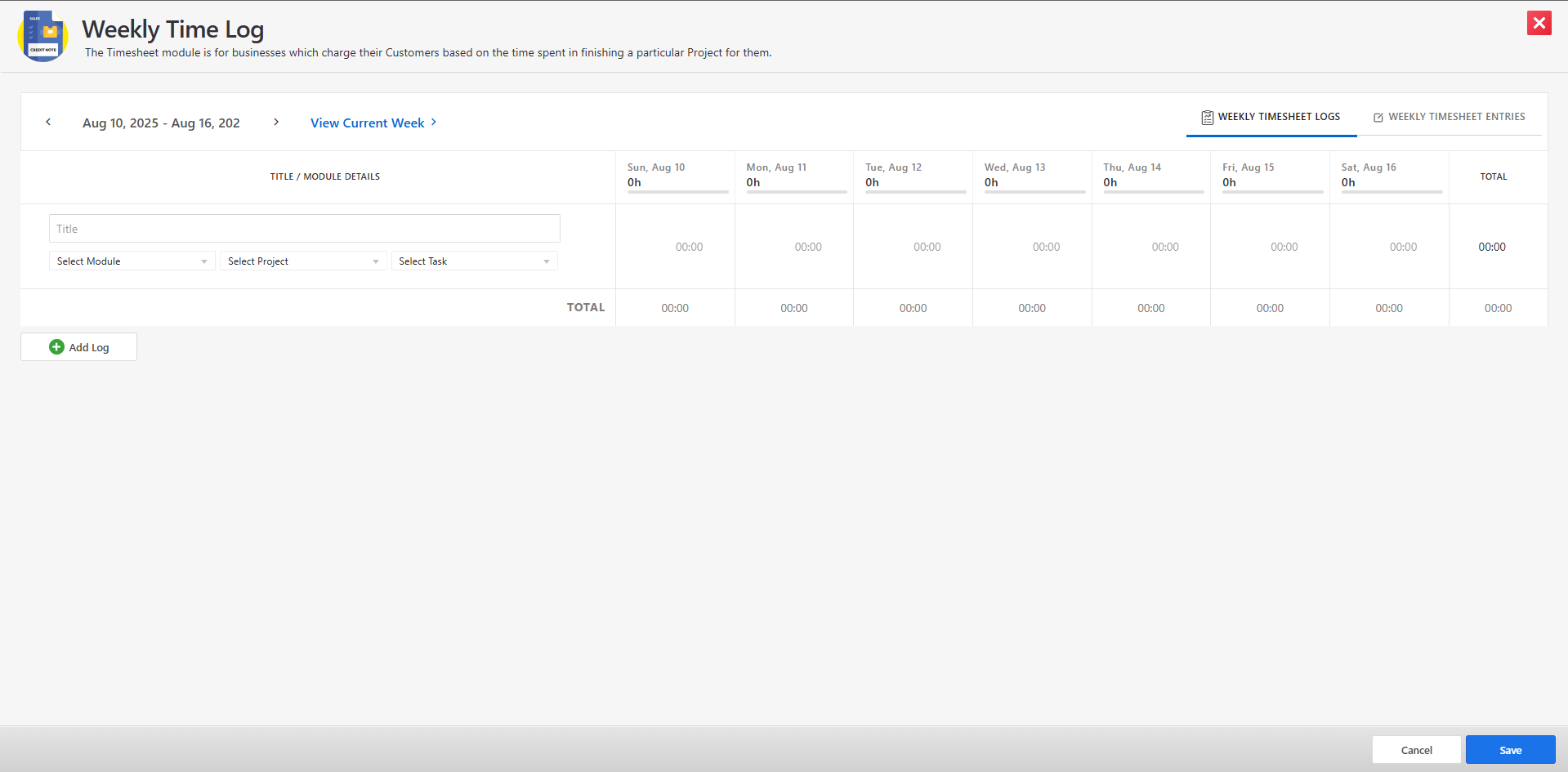 If you choose Weekly Log, a form will appear to enter time logs for an entire week.