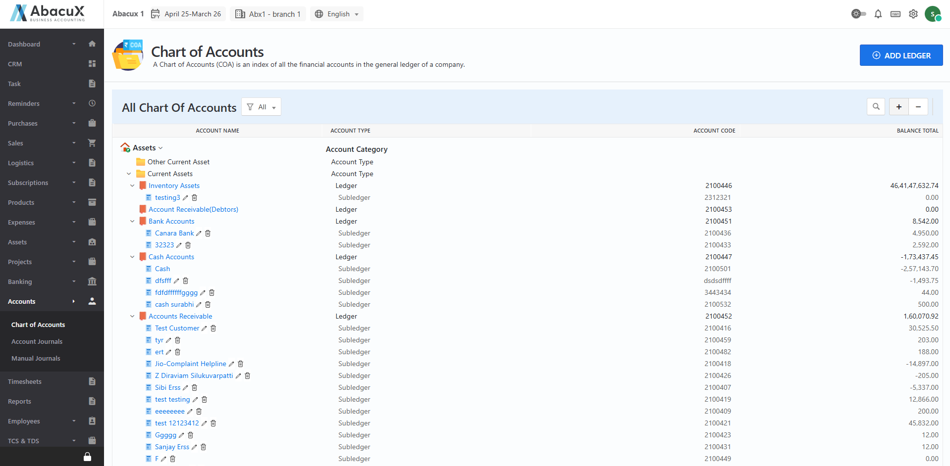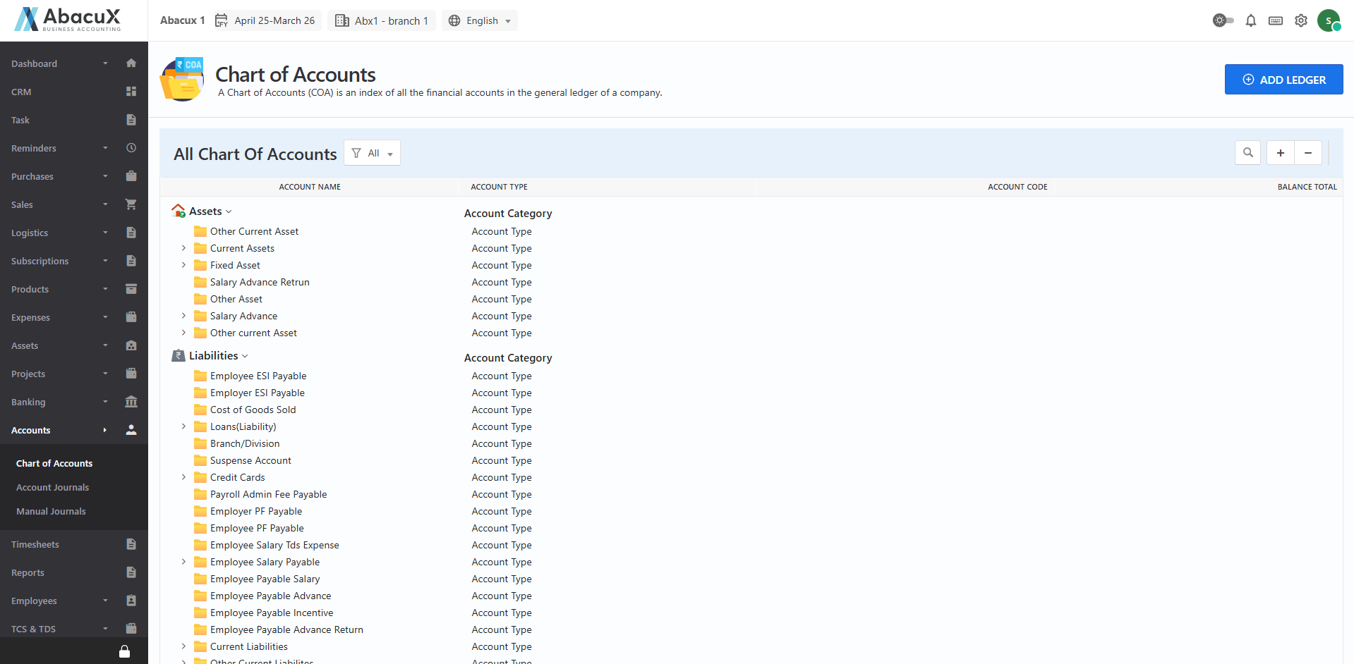 - Click the ‘+’ icon located at the top-right corner to expand the view and display the Account Categories, Account Types, Ledgers, and Sub-Ledgers.