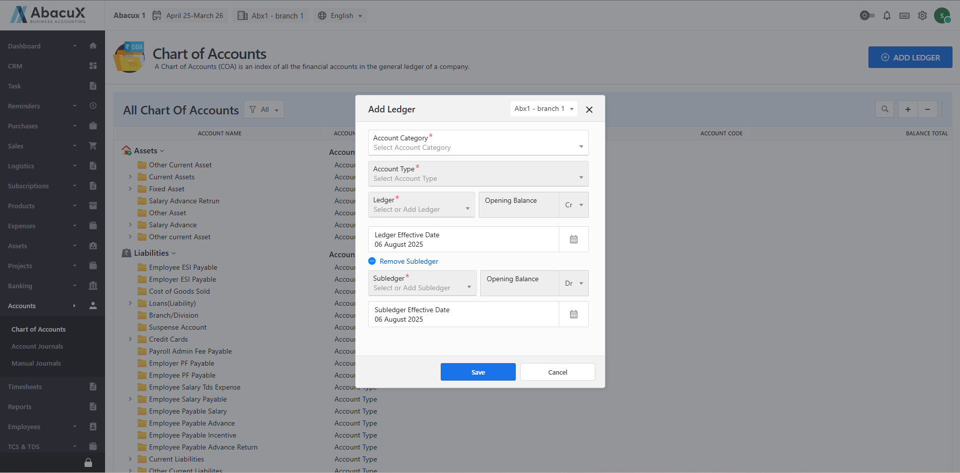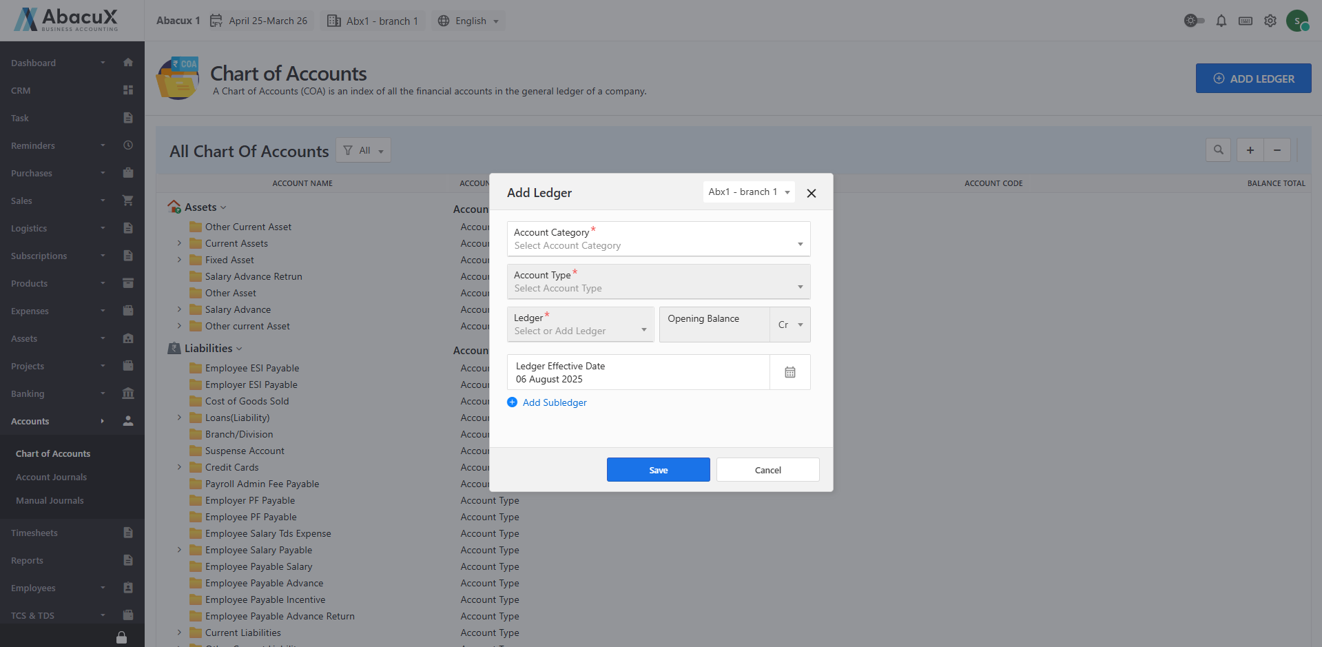 Fill in all the required fields and click Save to create the new ledger.
