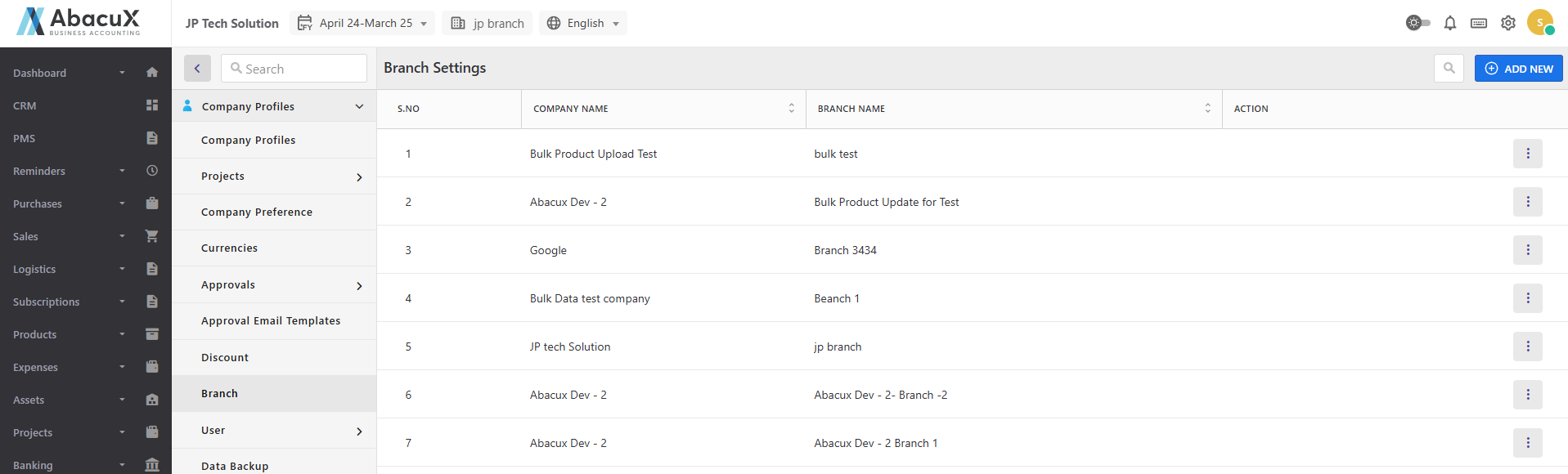 - Click the "+ Add New" button located in the top-right corner of the Branches List page.