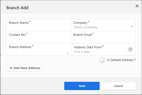 - A modal popup will appear with a form to enter the new branch details.