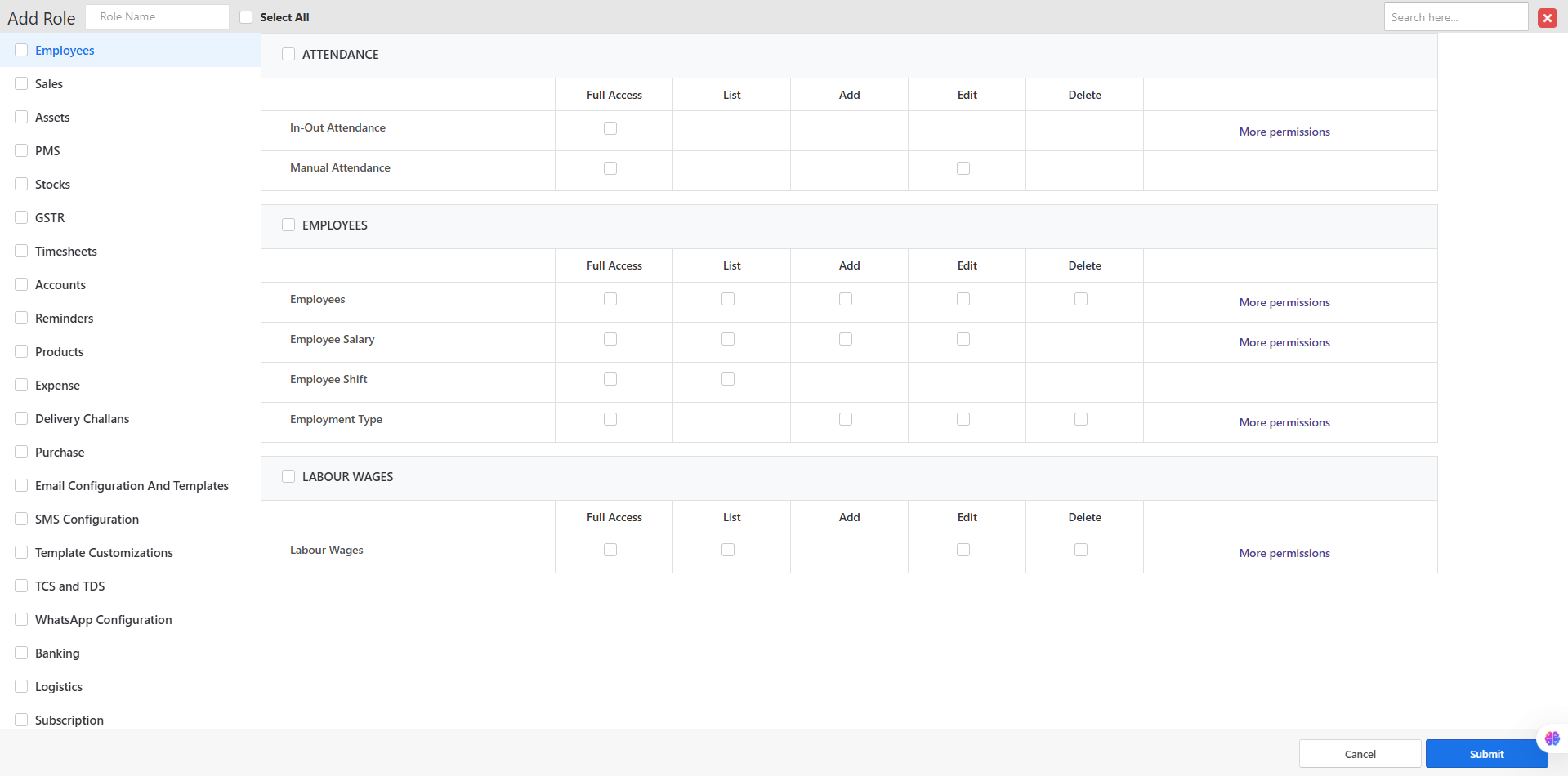 You may assign module-based permissions individually, or click the "Select All" checkbox at the top to assign all available permissions.