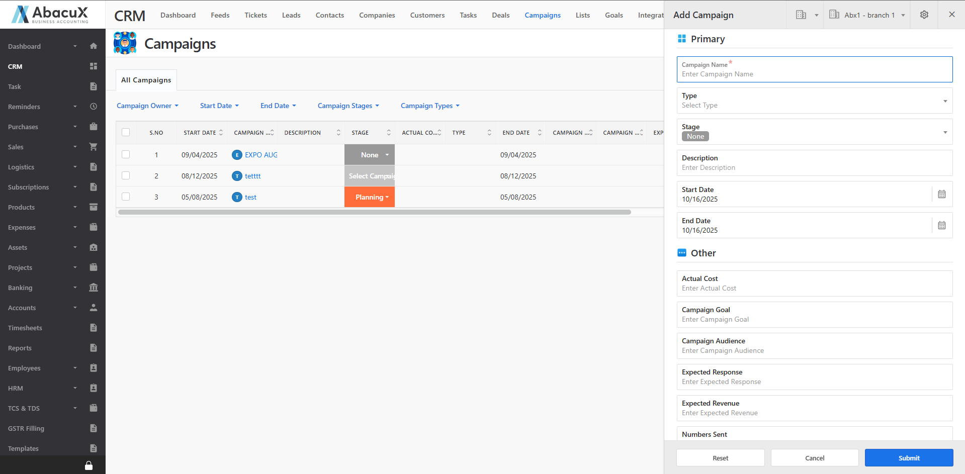The Campaigns module in the CRM helps you plan, manage, and track marketing and promotional campaigns effectively. It provides a centralized platform to organize campaign activities, monitor performance, and manage related leads, contacts, and deals.