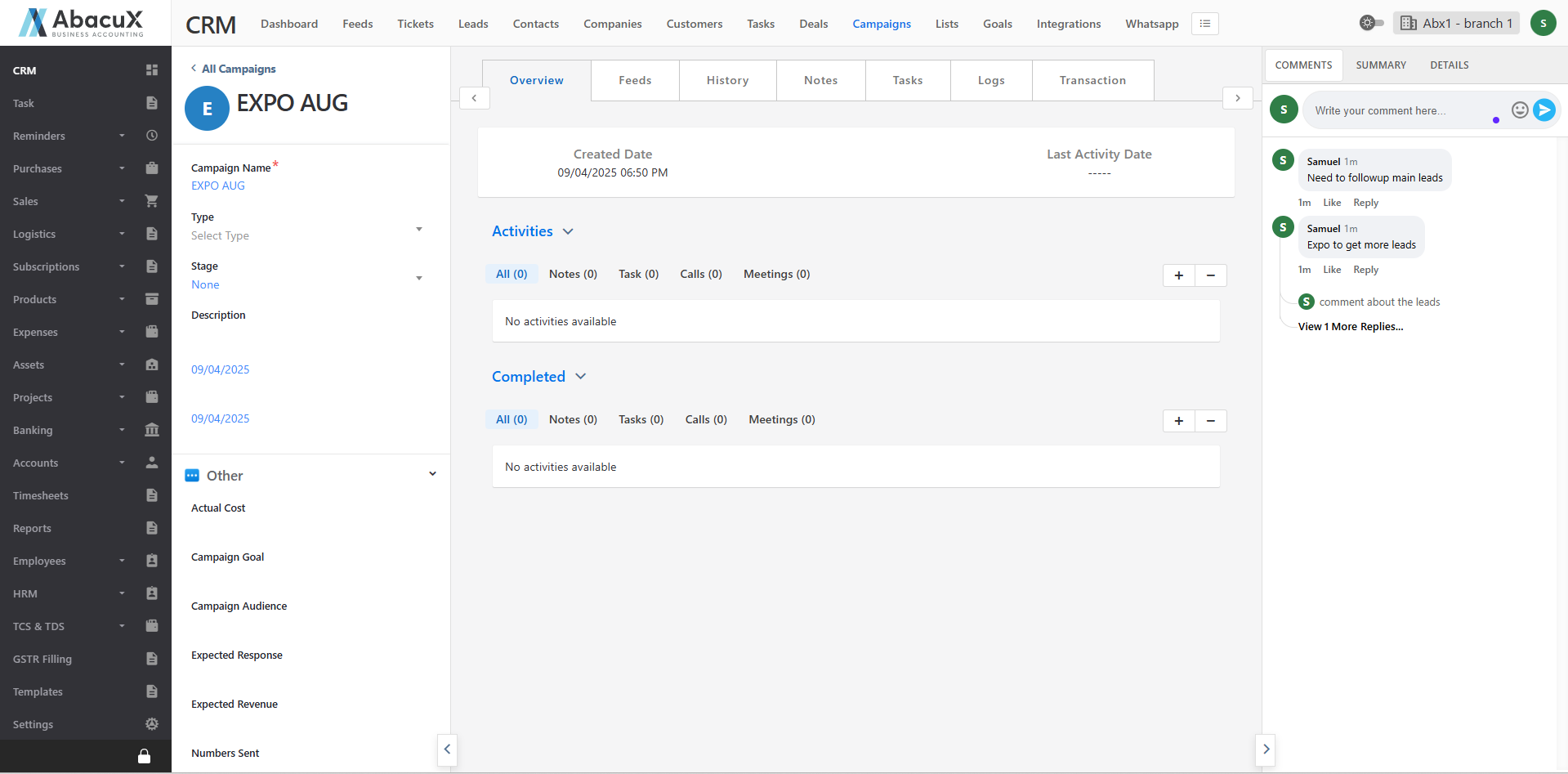 Click the Campaigns menu in the CRM to view the list of all campaigns.