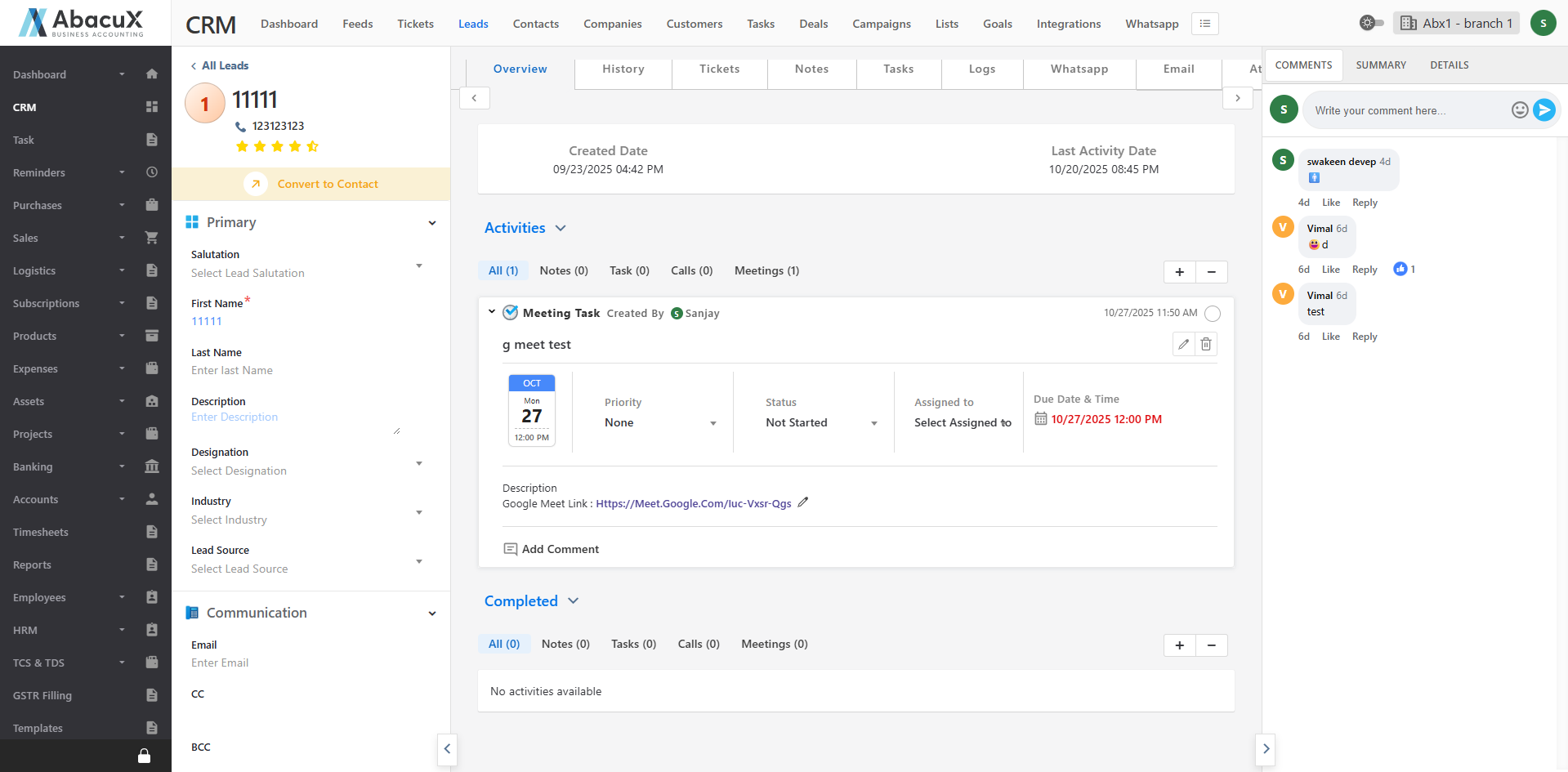 Comments: Used to post and manage comments or discussions about the lead.