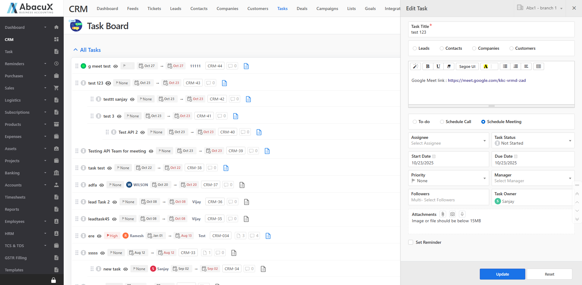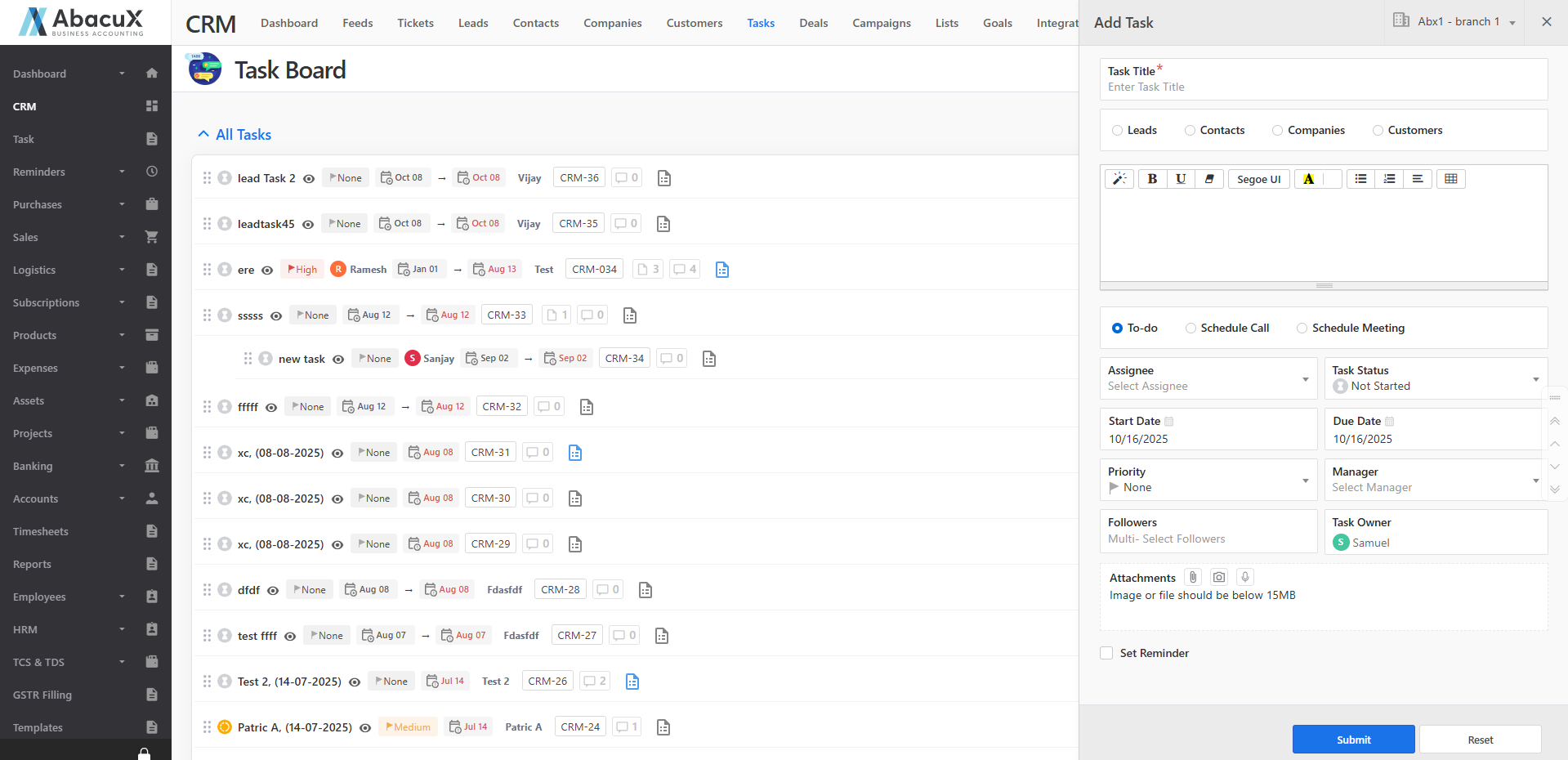 The Tasks module in the CRM allows users to create, manage, and track tasks efficiently. Each task can be associated with a Lead, Contact, Customer, or Company, ensuring all activities are properly organized and linked to the relevant entity.