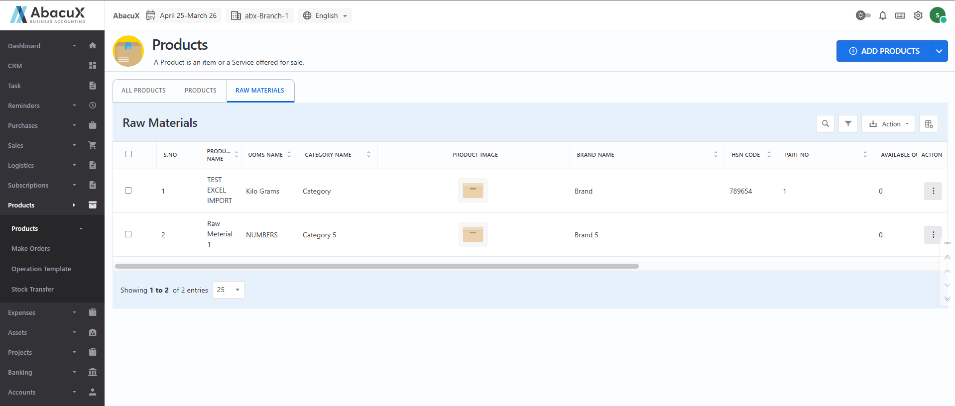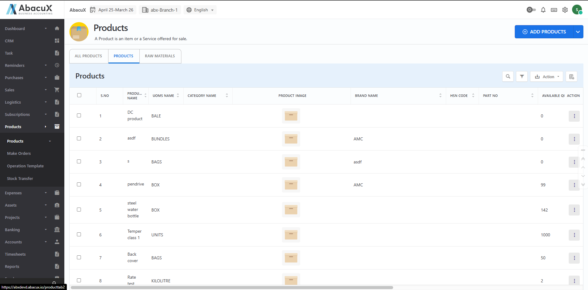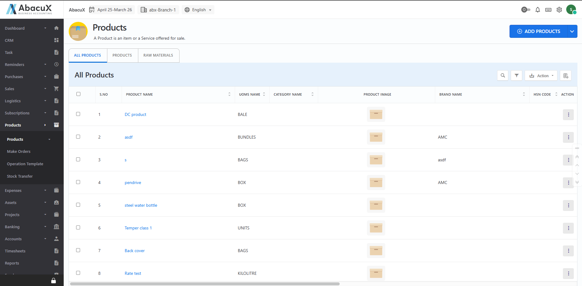 The Products tab displays the complete list of all products registered in the system. This includes inventory items, non-inventory items, raw materials, and services as applicable. It serves as the central hub for managing product-related data across various modules such as Sales, Purchase, and Inventory.