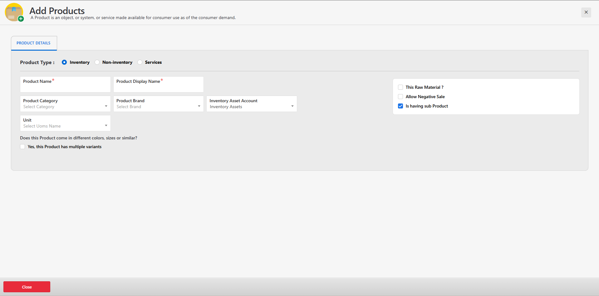 Select the main product to which the sub-product belongs, then enter the sub-product-specific details.