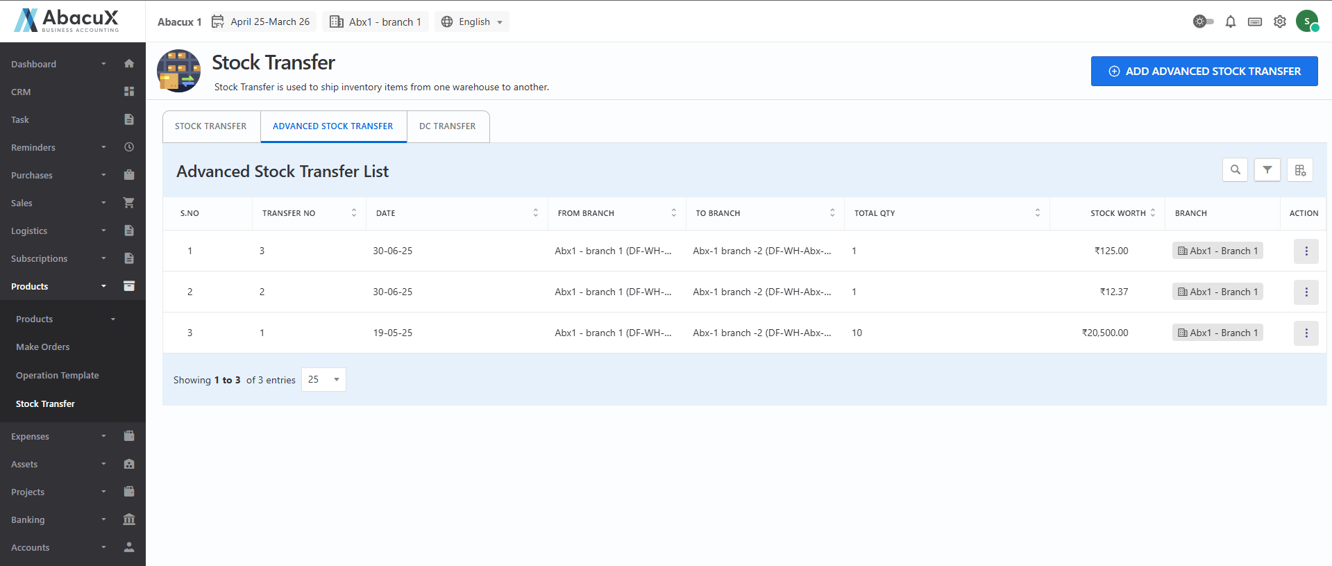 - Navigate to the Advanced Stock Transfer tab to view the list of all advanced stock transfer records.