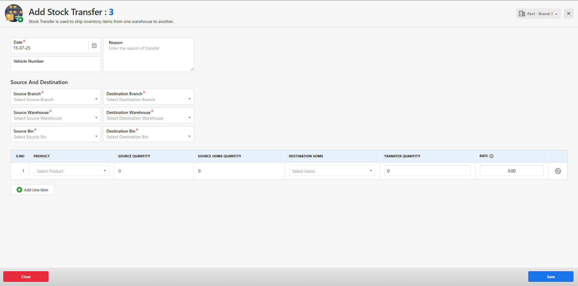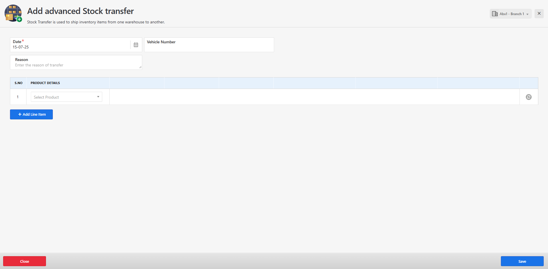 Fill in all the required fields and click Save to create the stock transfer record.
