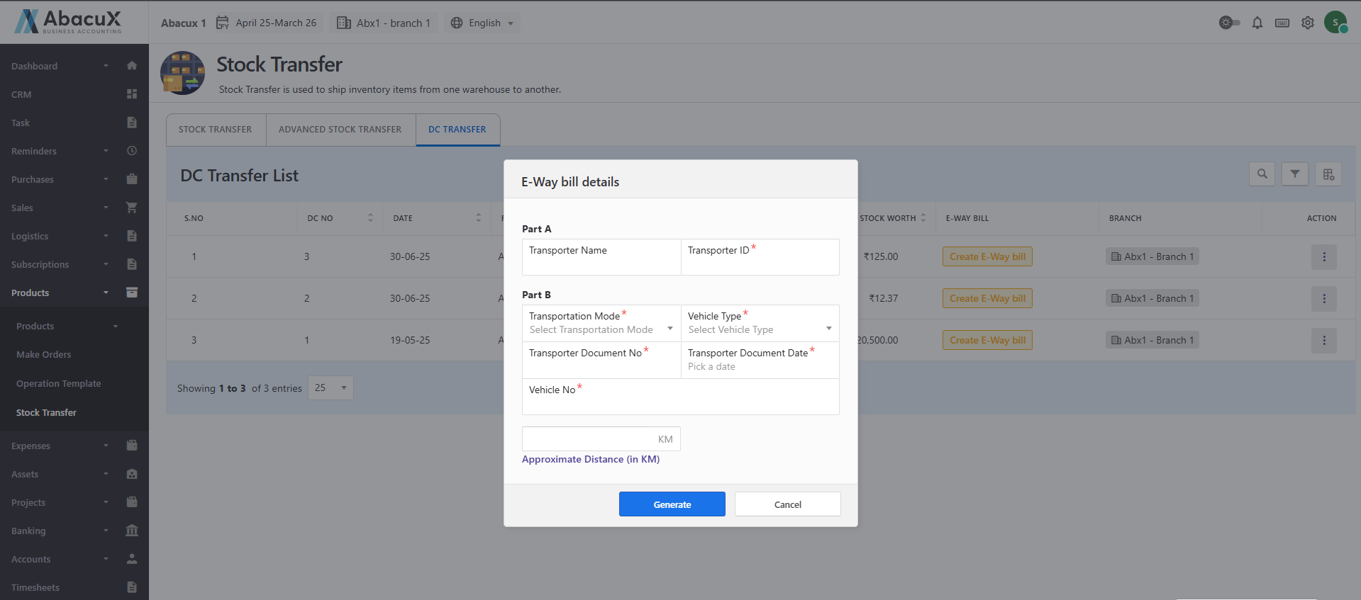 A form will open to enter the necessary E-way bill details.