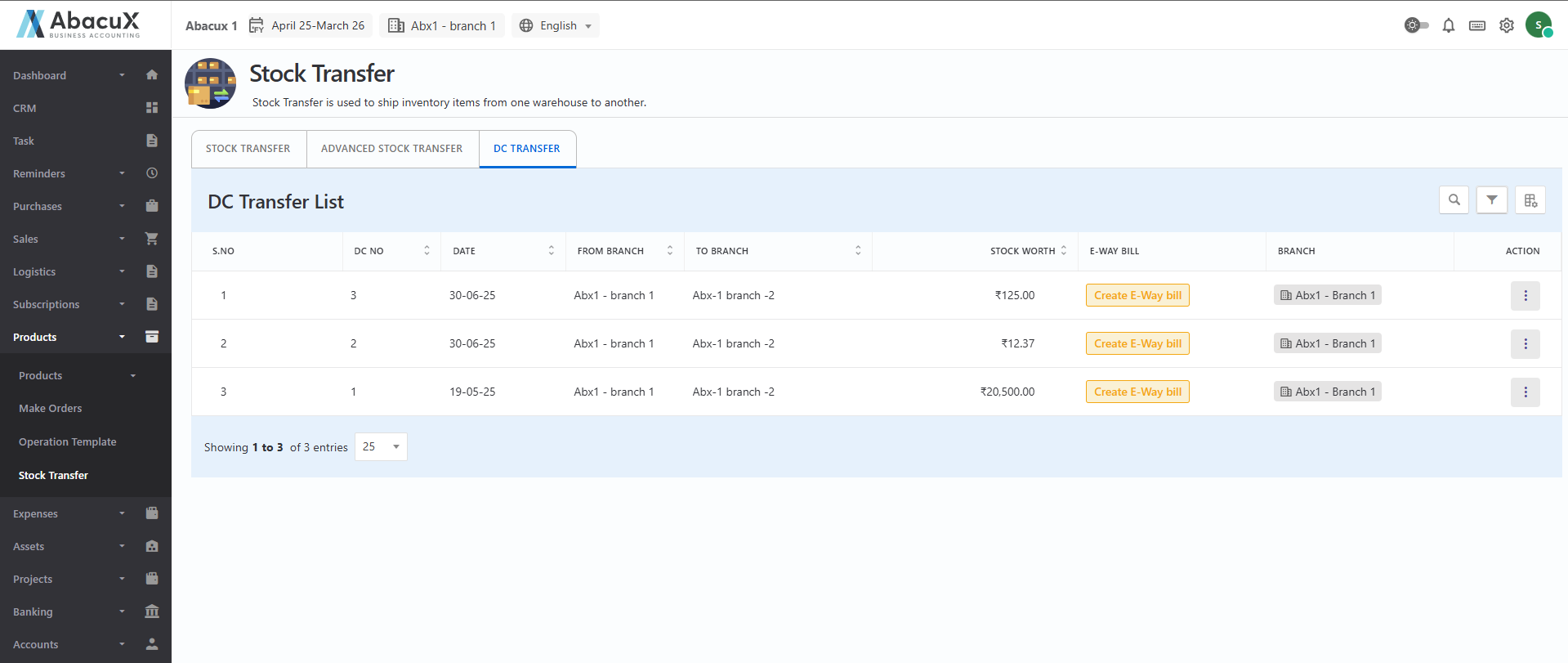 - Click on the DC Transfer tab to view the list of Delivery Challan (DC) transfers.