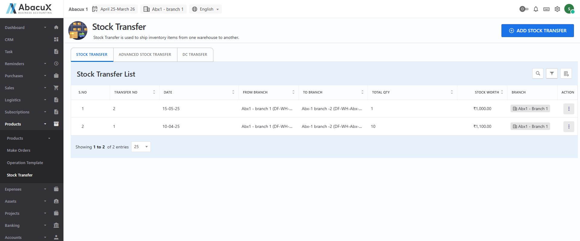 - Navigate to the Stock Transfer section to view the list of all stock transfer records.
