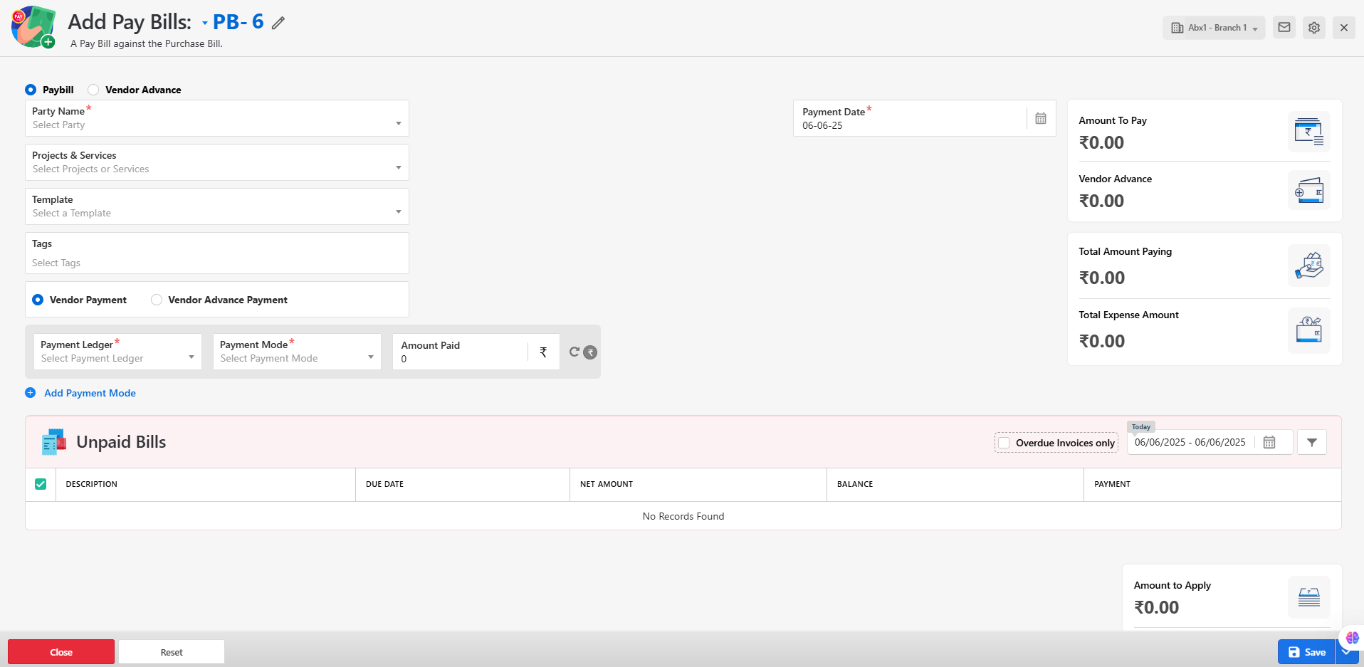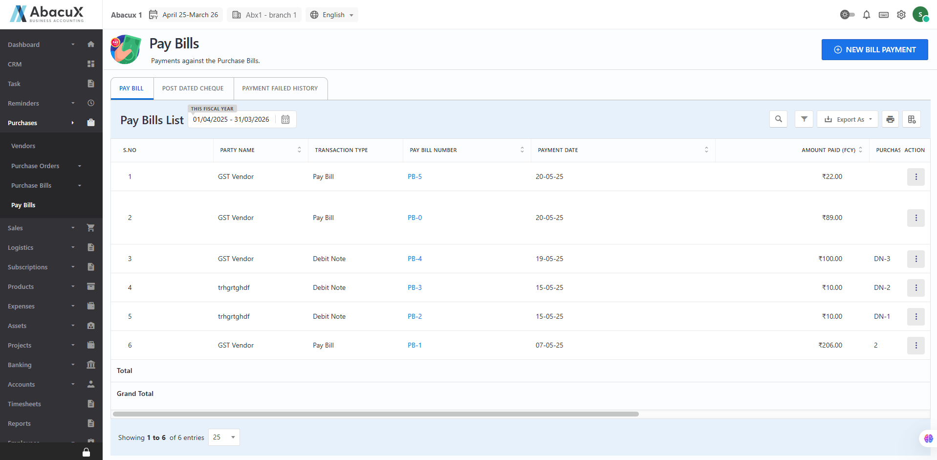 The Pay Bills module in the ERP system is designed to record and manage payments made to vendors against outstanding Purchase Bills. This feature ensures accurate tracking of due payments, vendor balances, and payment history for effective accounts payable management.
