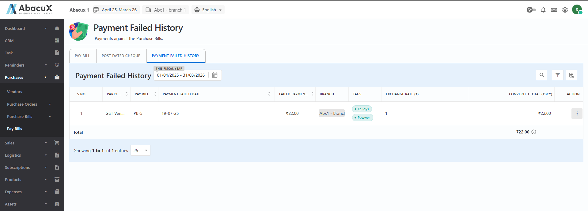 The Payment Failed History module is used to track and manage all failed or unsuccessful payment attempts made against Purchase Bills. This feature ensures transparency and accountability in vendor payment processes by maintaining a log of failed transactions, their reasons, and follow-up actions.