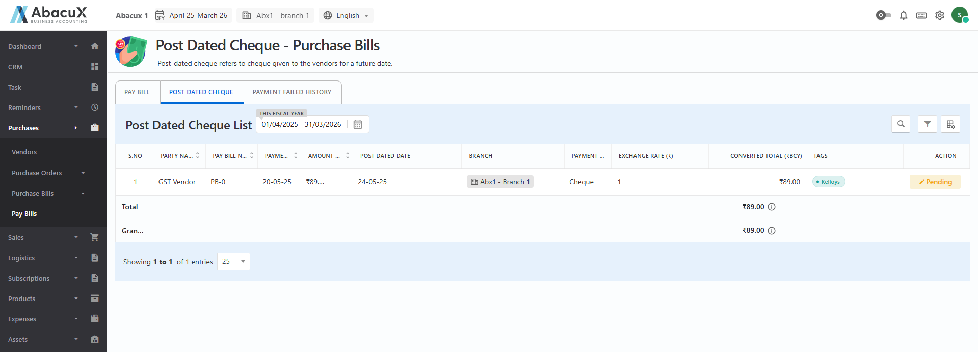 - The list view will display all previously recorded post-dated cheque payments, including status, vendor name, bill reference, cheque number, post date, and amount.