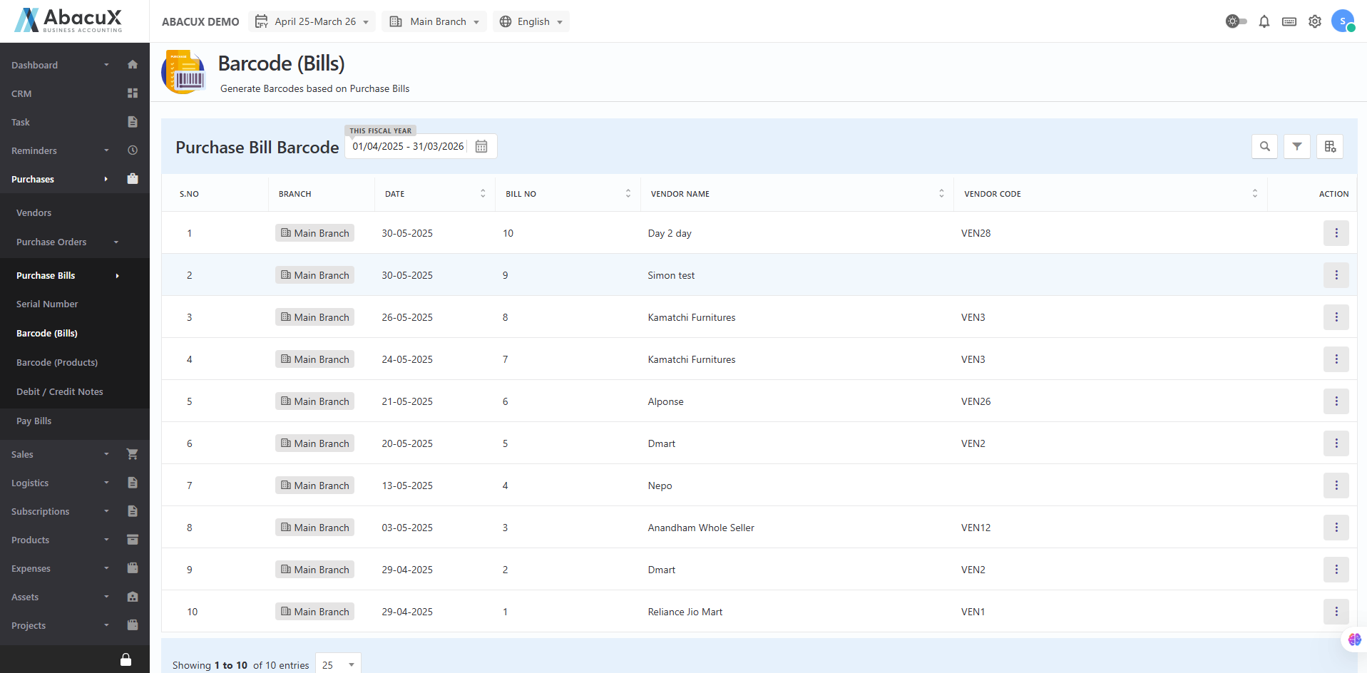 The Barcode (Bills) module in the AbacuX application allows users to automatically generate barcodes for items listed in Purchase Bills. This feature streamlines inventory handling, improves stock traceability, and enhances accuracy in item identification during goods inward, sales, transfers, and stock audits.