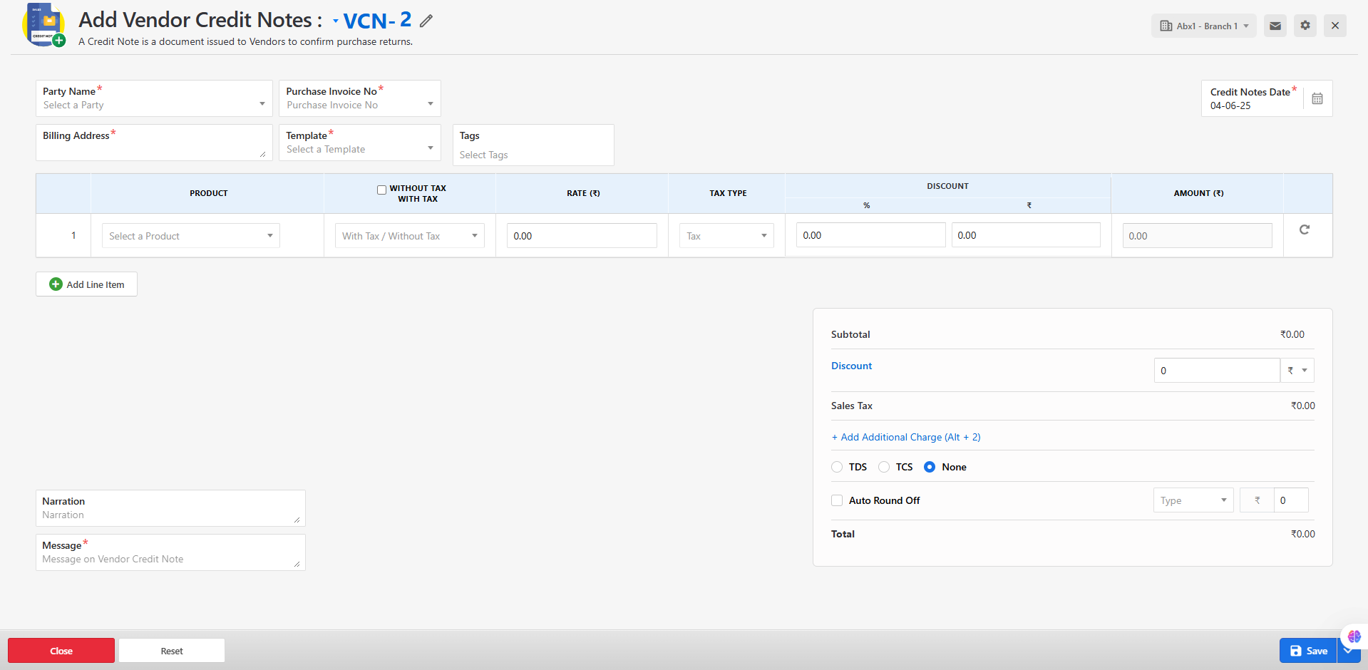 - Click the "New Vendor Credit Note" button located at the top-right corner of the list page to initiate a new entry.