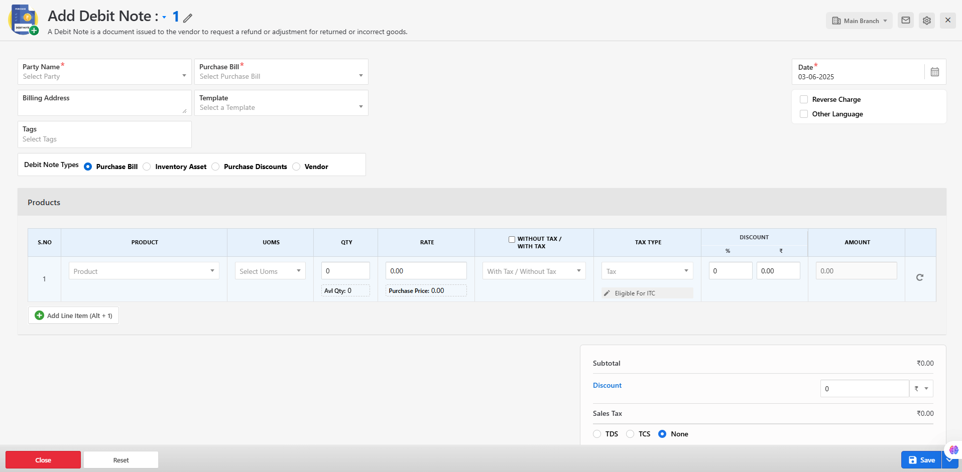 - A form will appear where you can input the necessary details such as vendor name, reference bill, item details, reason for return, amount, and tax information.
