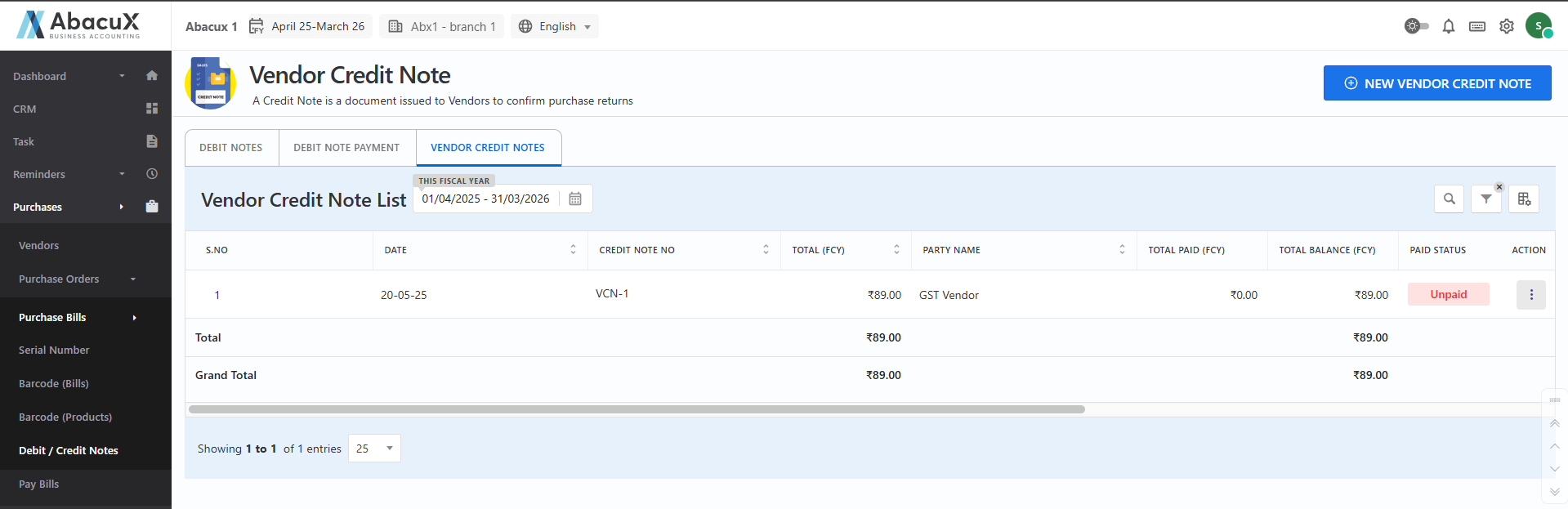 - Navigate to the "Vendor Credit Note" tab to view the list of all recorded vendor credit notes.