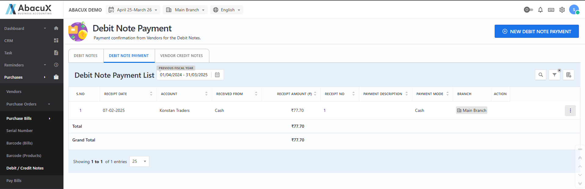 - Navigate to the "Debit Note Payment" tab. This will display the list of all recorded debit note payments.