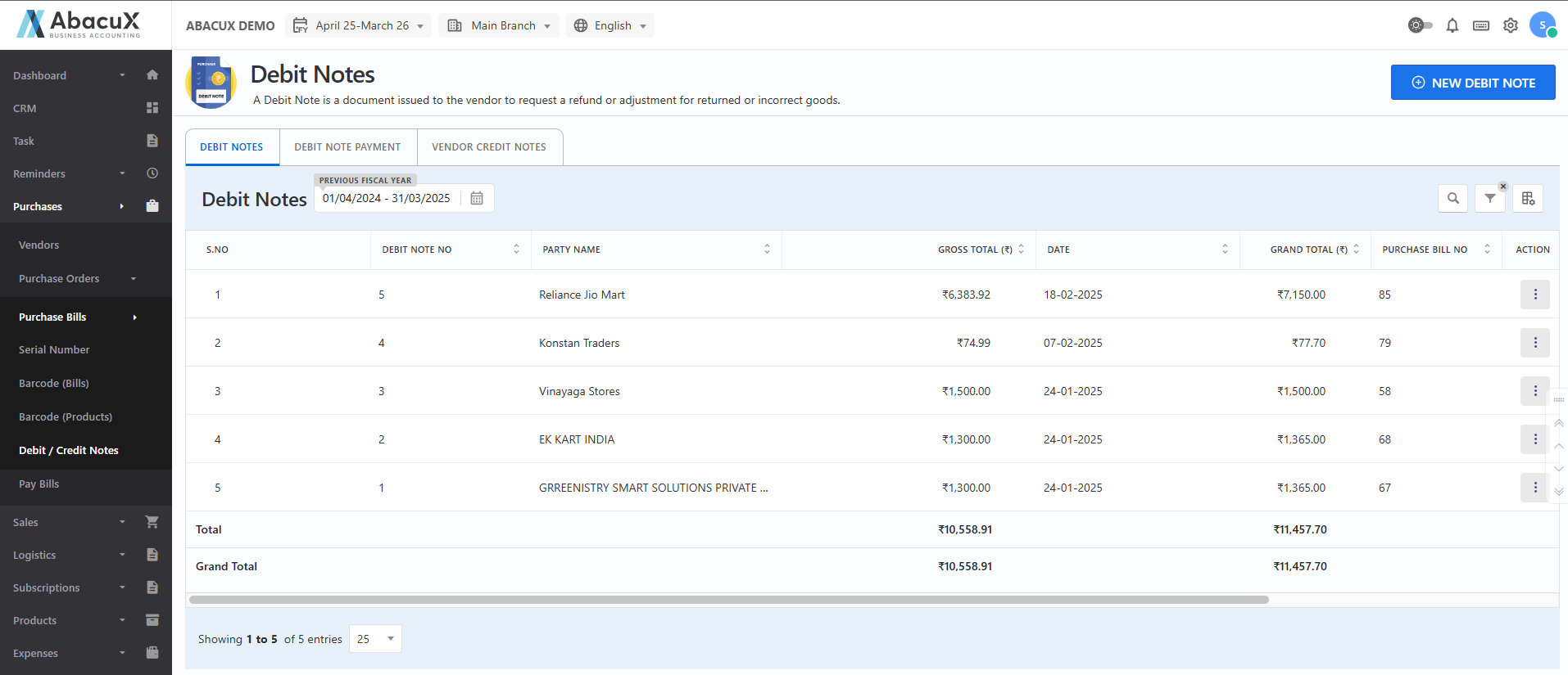 - If the form is saved successfully, a success message will appear and the new debit note will be visible in the list.