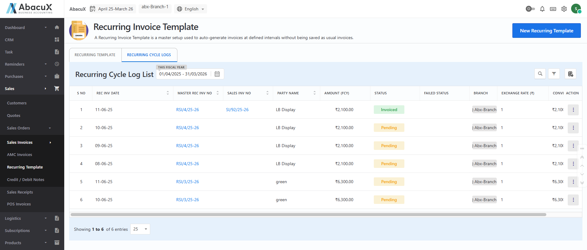 - Navigate to Sales > Sales Invoice > Recurring Cycle Logs to view the list of recurring cycle log entries.