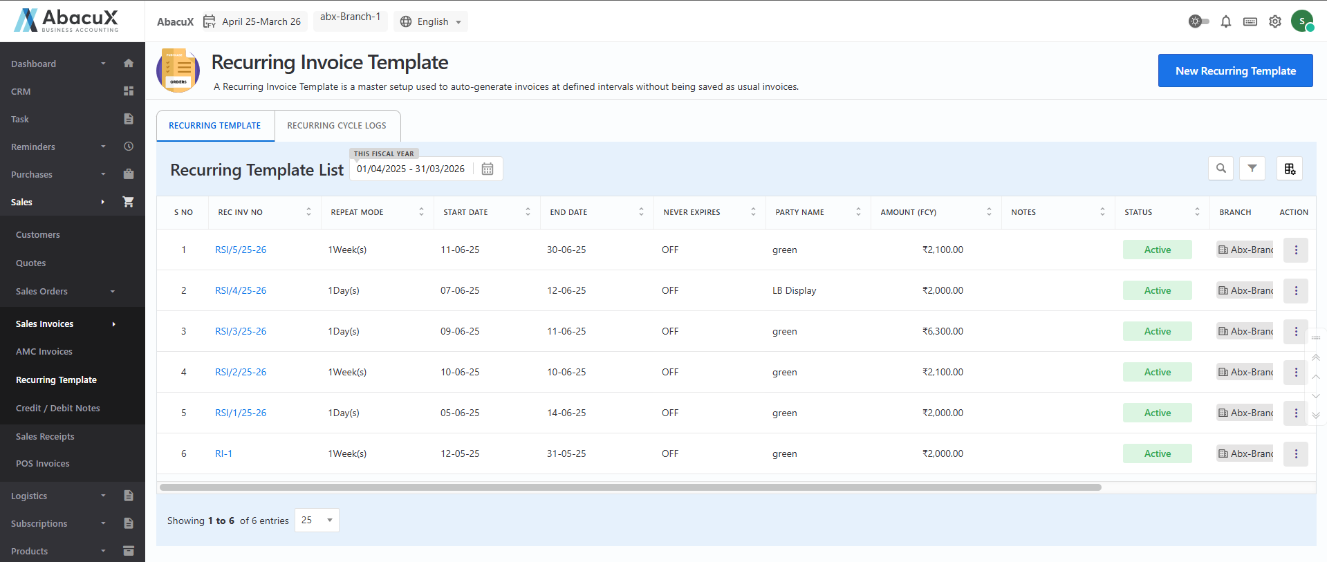 - Navigate to Sales > Sales Invoice > Recurring Template to access the list of existing recurring invoice templates.