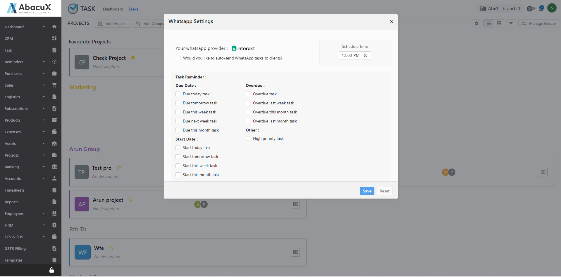 - Click the Settings icon to configure additional options such as setting reminders and sending tasks via WhatsApp.